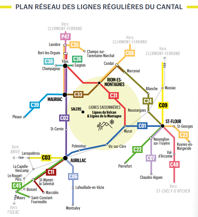 Coordonnées et informations Site internet Région Transport Téléphone : 04 8000 7000 Abonnez-vous ou achetez des tickets unité: | Transports interurbains du Cantal : Consultez les horaires, les lignes desservies, les info trafic et toutes les informations pour organiser votre voyage dans le Cantal. - plans : https://www.laregionvoustransporte.fr/media/4506/download?inline=inline |